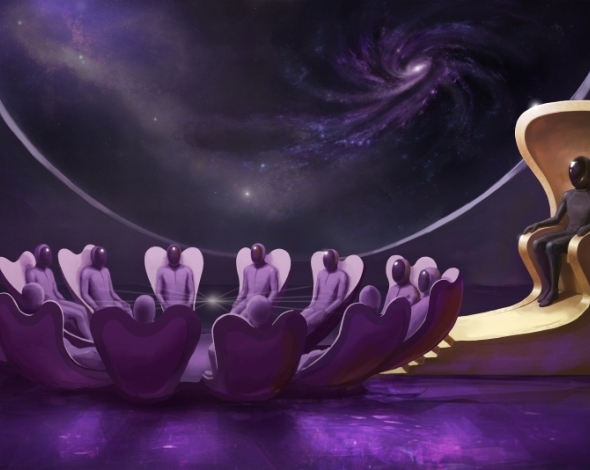 I am sitting in a circle with about a dozen others in a room. I notice none of us have distinct faces but rather visors like the helmets on space suits. There was someone seated at some distance on a golden throne. Although we appeared to be an anonymous group, each one of us had an individual contribution to make. We had a particular energy, like the cord of a harp or a lyre. These were being plucked like a musical instrument. In a way I did not understand - or need to understand – it was part of a kind of cosmic orchestra that guided the evolution of the universe.